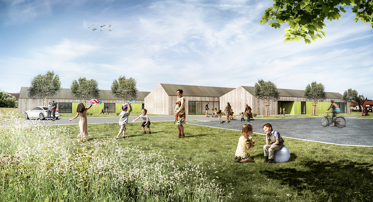 Spannend war das Raumprogramm, dass zunächst zwei Gruppen mit der Erweiterbarkeit um bis zu 10 weitere vorsah. Unser Team entschied sich für eine verschränkte Kammstruktur, bestehend aus einzelnen Satteldachgebäuden, deren besonderer Clou die einfache Erweiterung und Ergänzung ist.