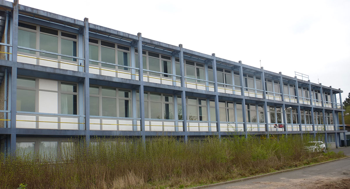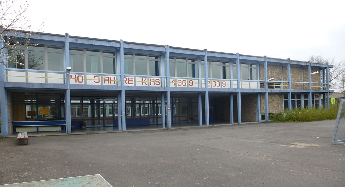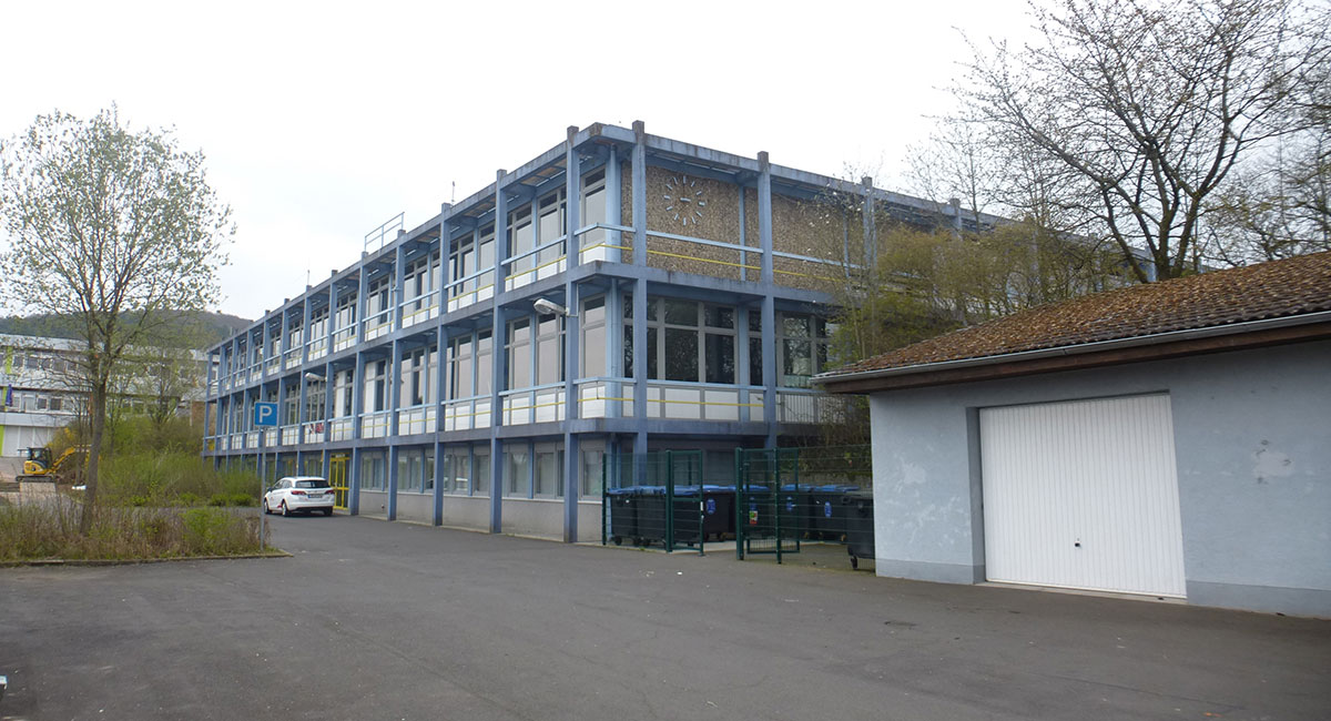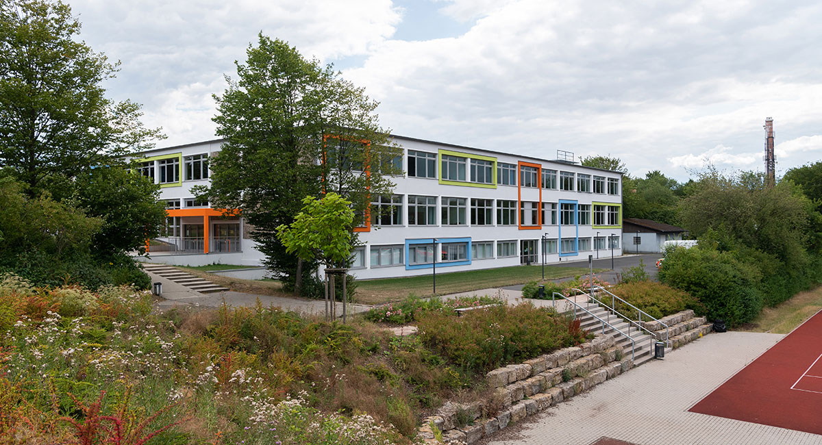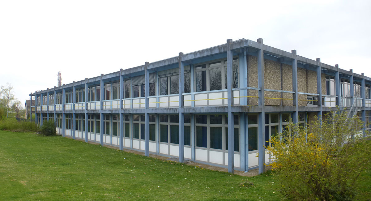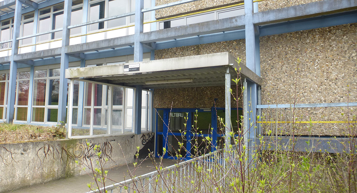 Graue Waschbetonplatten und blaue Betonsäulen – seit 1964 kannten die Petersberger so das Hauptgebäude der Konrad-Adenauer-Schule. Während das Gebäude im Inneren immer wieder umgebaut und modernisiert wurde, blieb die Fassade über Jahrzehnte gleich.