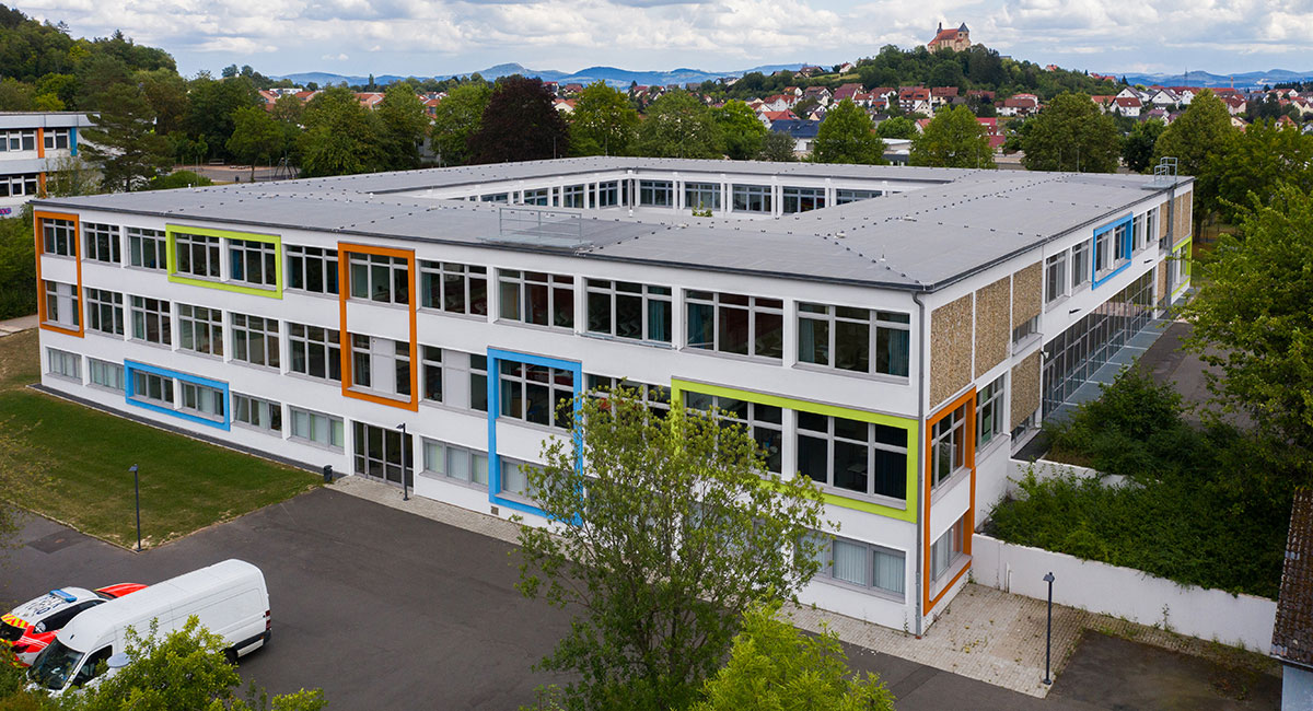 Neben der Fassade wurde auch das Dach bei der energetischen Sanierung gedämmt und neu abgedichtet. Flucht- und Rettungswegtüren wurden erneuert und der überdachte Pausenhof in das Gebäude integriert.