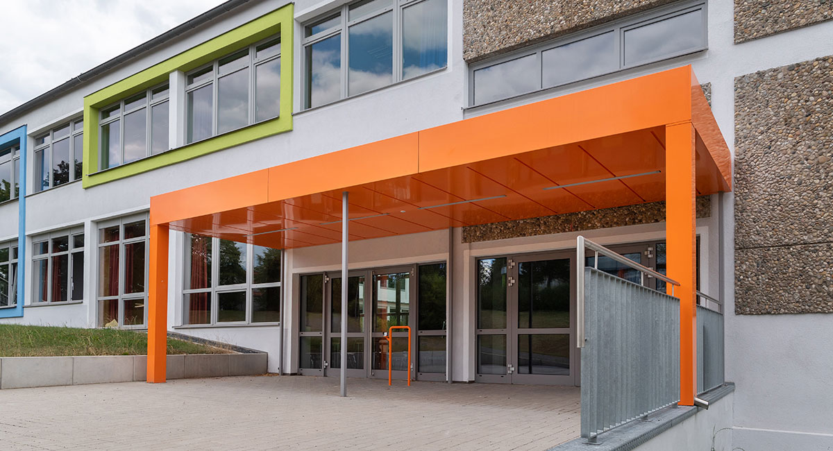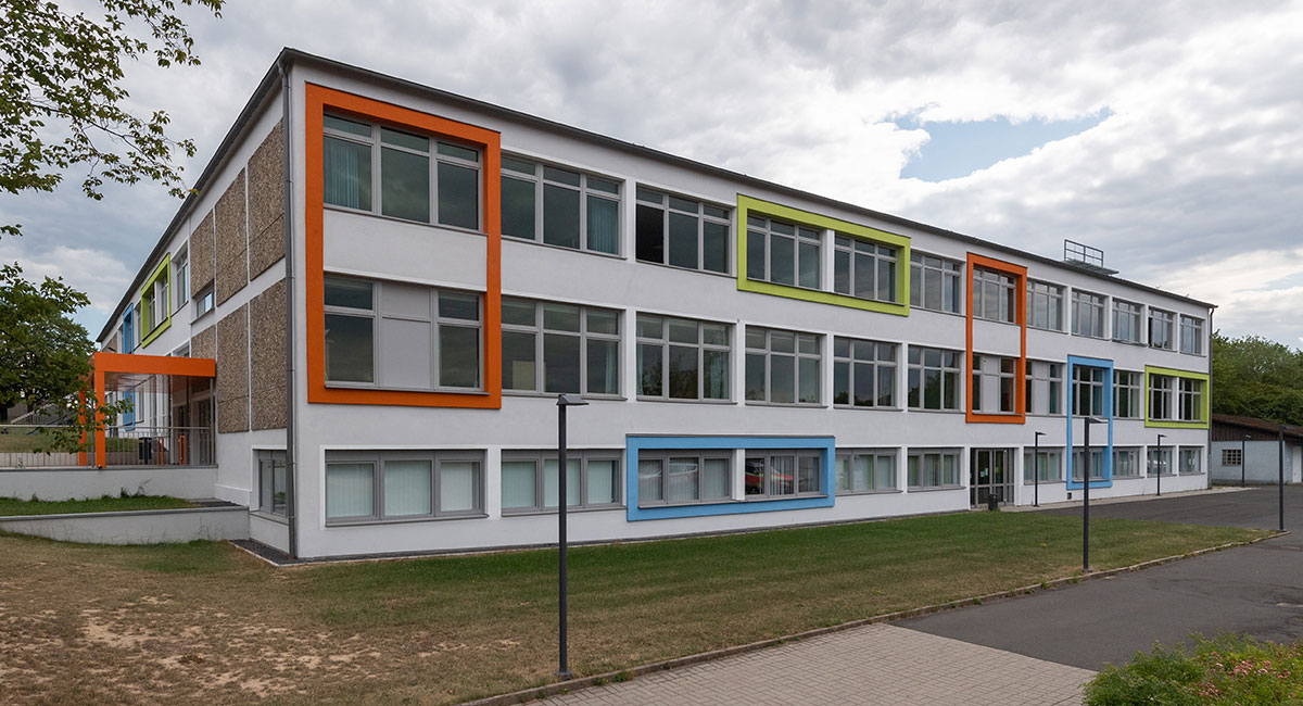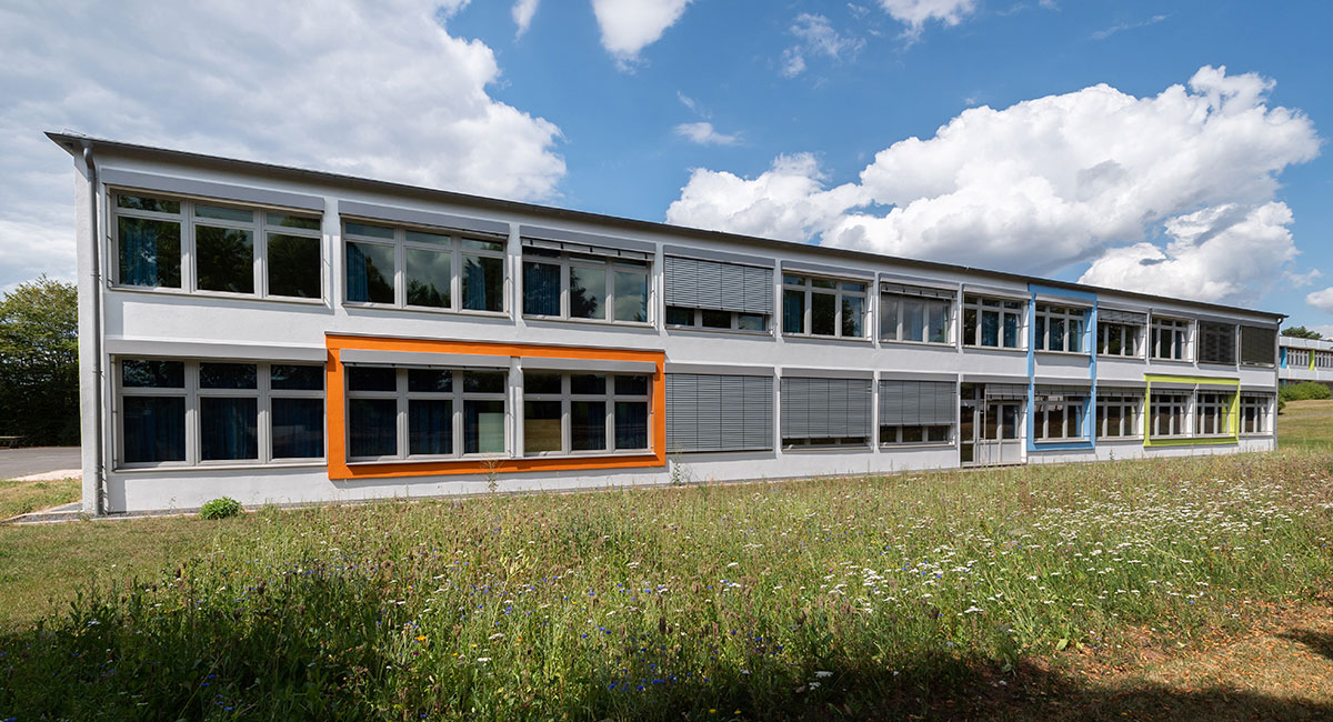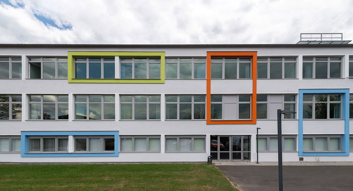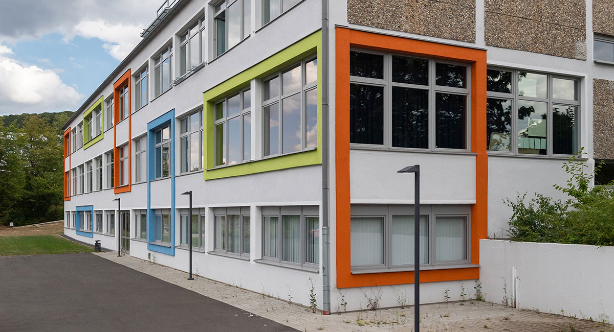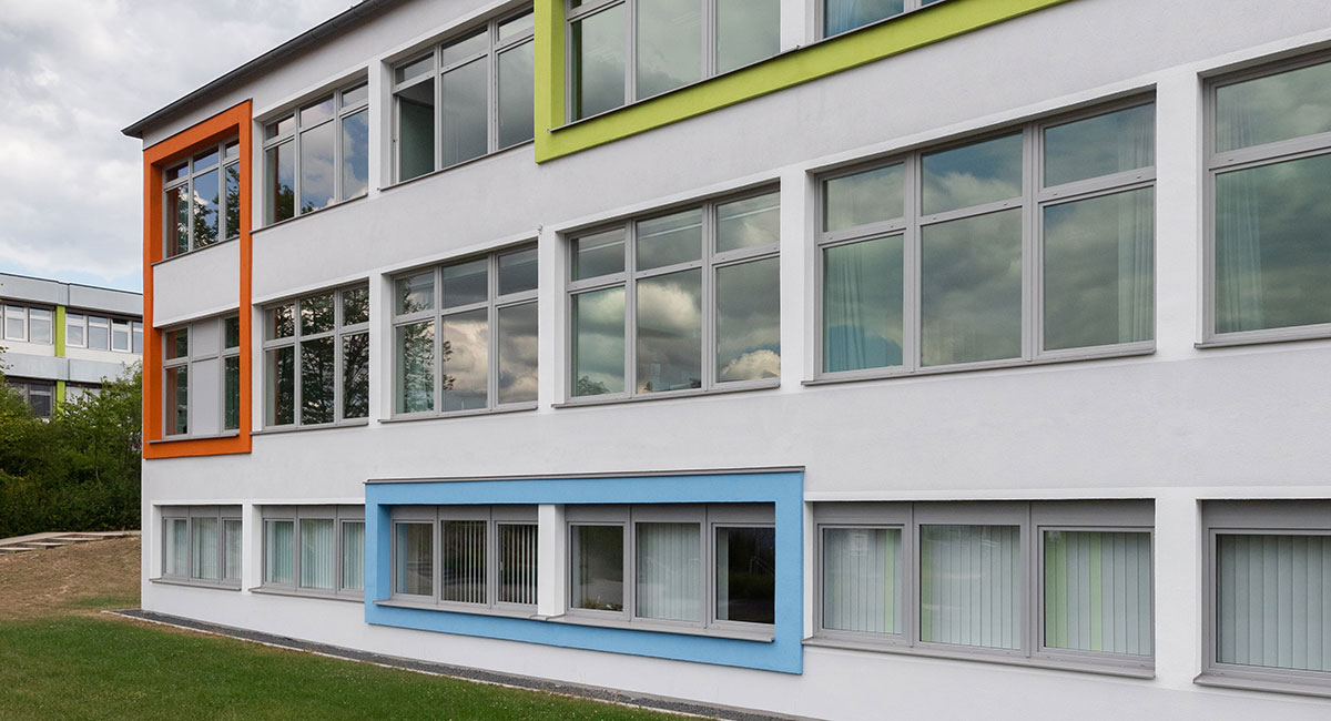 Nach dem Entfernen der Skelettstruktur wurden die Außenwände mit einem Wärmedämm-Verbundsystem versehen, die Fenster-Unterlichter überdämmt und eine Holz-Unterkonstruktion mit Steinwolle-Lamellen angebracht. Die Fassade erhielt einen warmgrauen Grundton. Weiße Faschen betonen Fensterbänder und Türen. Der besondere Clou: Dreidimensionale Akzente in bunten Farben, die als stehende und liegende Rahmen-Elemente zum Einsatz kommen, sorgen für einen hohen Wiedererkennungswert und geben der Schule ein neues Gesicht.