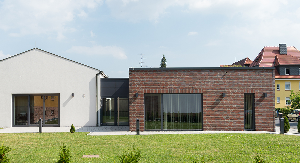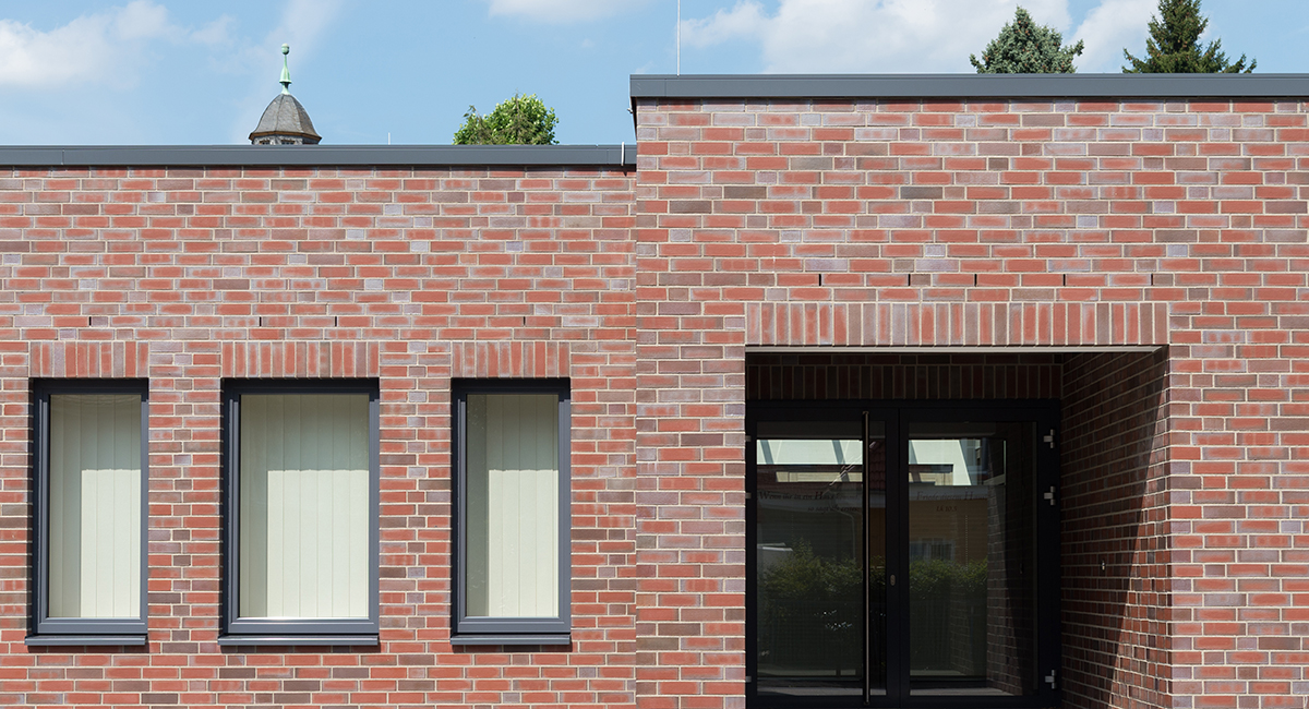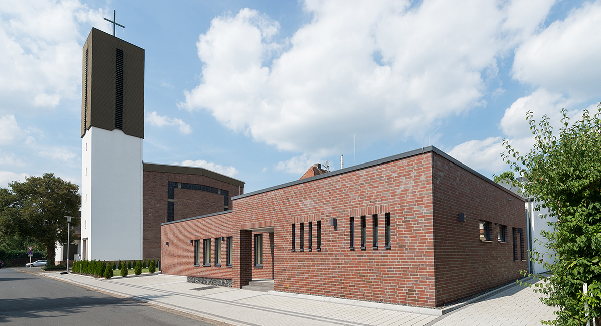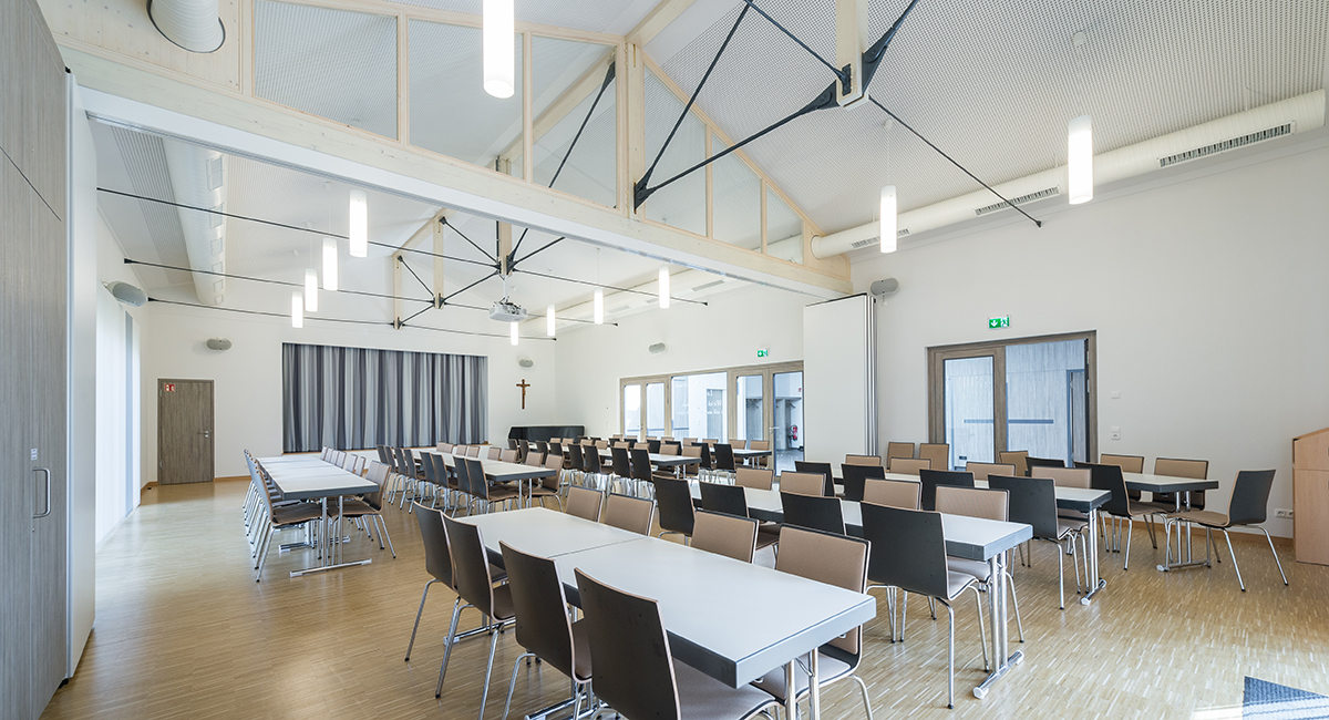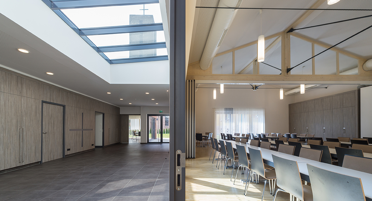 Entlang der Brüder-Grimm-Straße nimmt ein flacher Baukörper Gruppen-, Musik-, Nebenräume und Küche auf. Veranstaltungen unterschiedlicher Größe finden im dahinter liegenden flexibel teilbaren Saalgebäude mit modernster Medientechnik statt. Mittler zwischen den beiden Baukörpern ist das von oben belichtete Foyer mit direktem Zugang zum Pfarrgarten. Dass das gesamte Pfarrheim dabei barrierefrei zugänglich ist selbstverständlich. Den visuellen Bezug zu Pfarrkirche und -haus stellen die Fassadenmaterialien Klinker und Putz her.