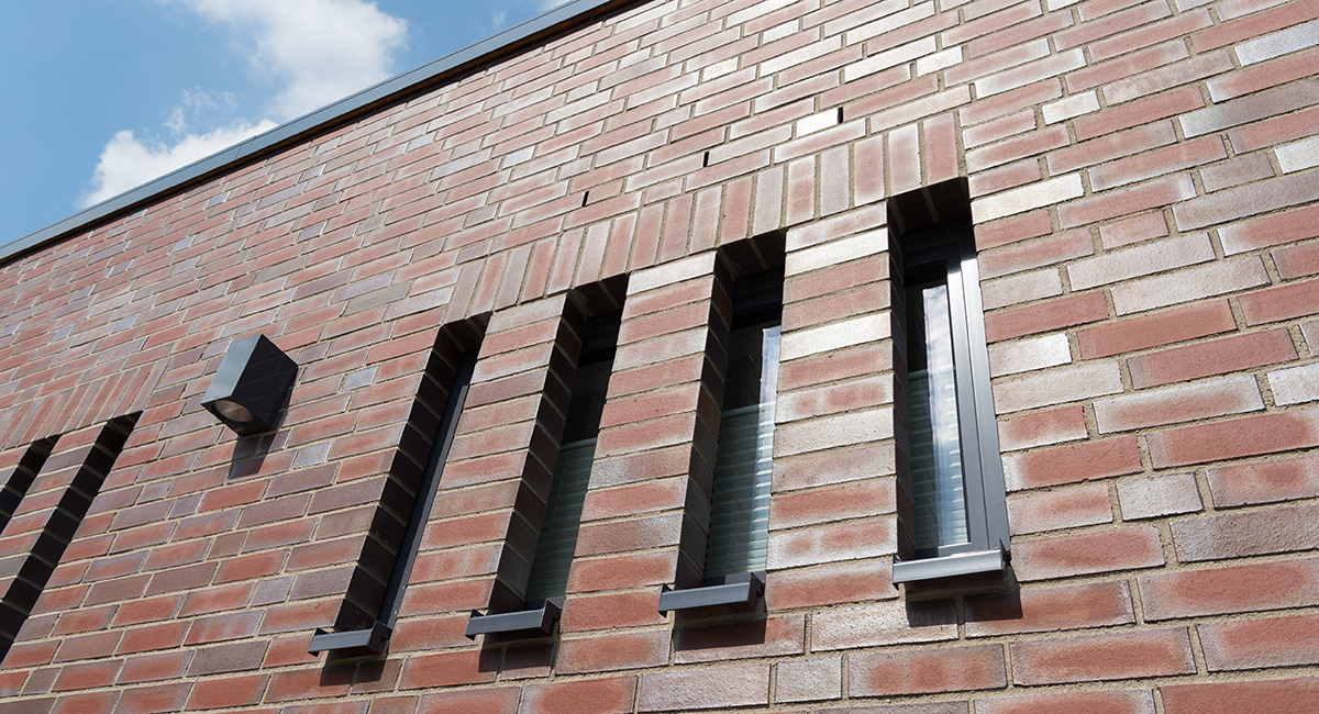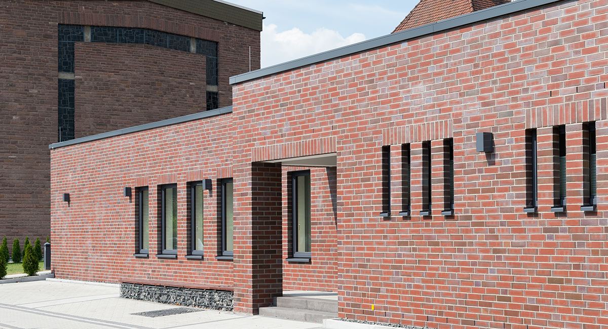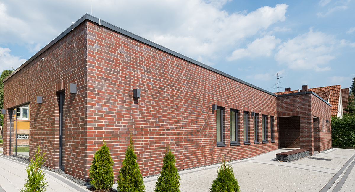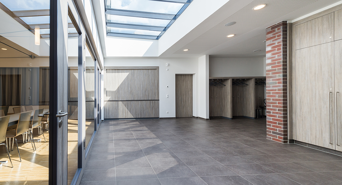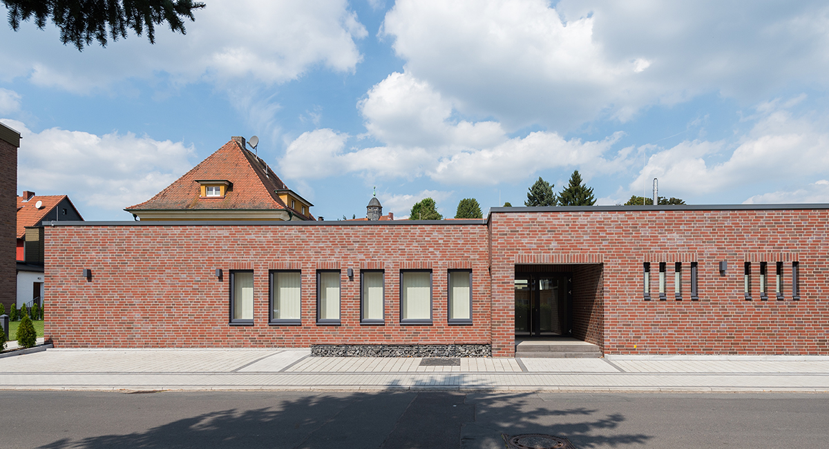 Entlang der Brüder-Grimm-Straße nimmt ein flacher Baukörper Gruppen-, Musik-, Nebenräume und Küche auf. Veranstaltungen unterschiedlicher Größe finden im dahinter liegenden flexibel teilbaren Saalgebäude mit modernster Medientechnik statt. Mittler zwischen den beiden Baukörpern ist das von oben belichtete Foyer mit direktem Zugang zum Pfarrgarten. Dass das gesamte Pfarrheim dabei barrierefrei zugänglich ist selbstverständlich. Den visuellen Bezug zu Pfarrkirche und -haus stellen die Fassadenmaterialien Klinker und Putz her.
